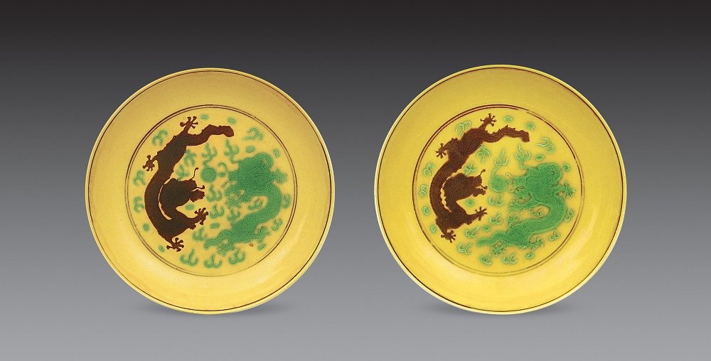 010清同治 黄地赭绿彩双龙戏珠纹盘一对