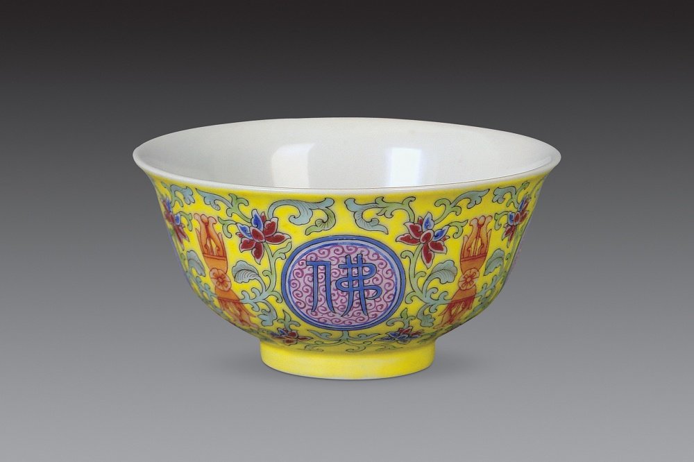 015清道光 黄地粉彩开光佛日常明纹碗