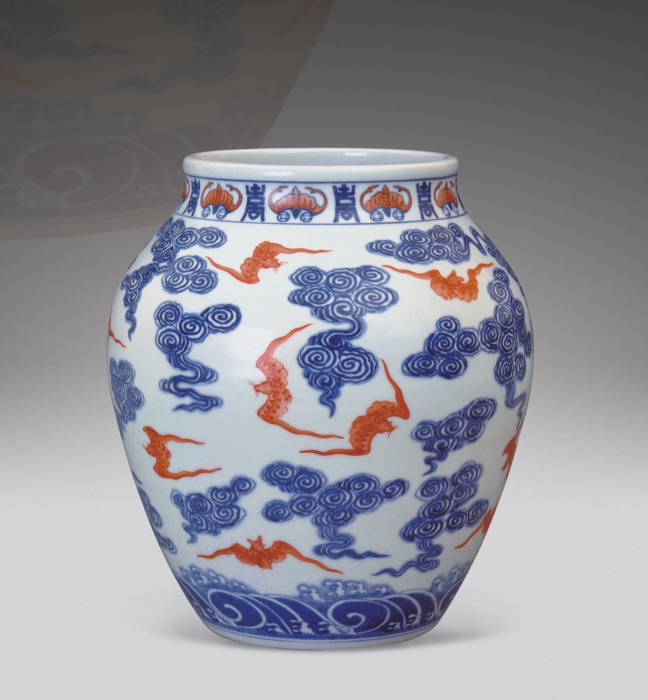 清宣统 青花矾红云蝠纹罐