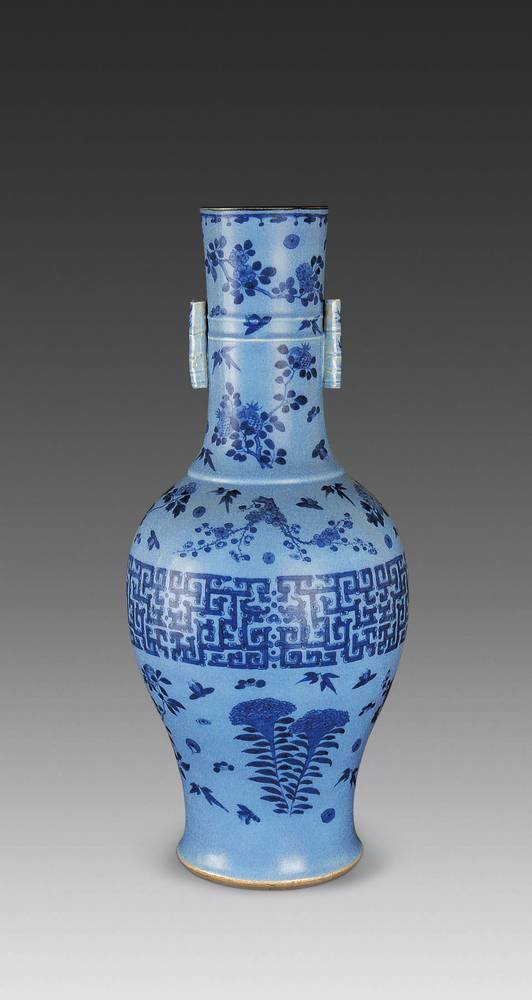 天蓝釉青花花卉纹直口惯耳大瓶