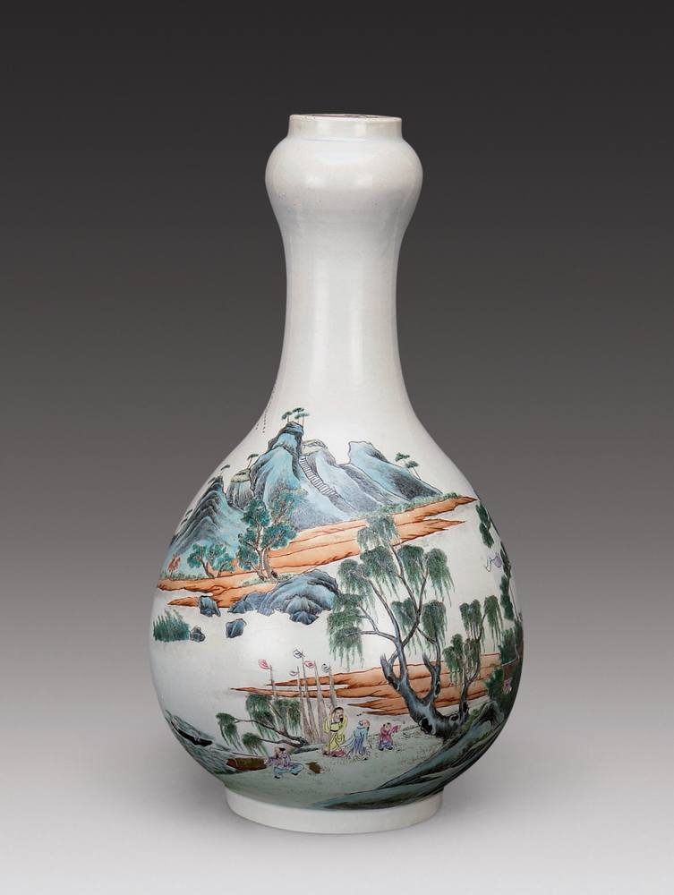 粉彩山水人物蒜头瓶