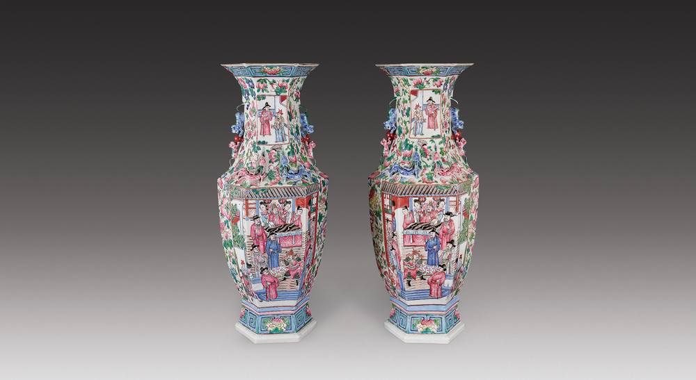 粉彩人物六方瓶(一对)